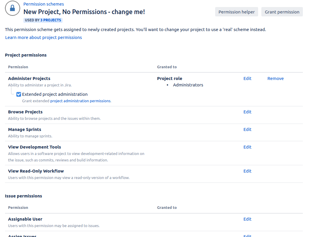 For instance, if you want to force the administrator to choose another permission scheme, you might like to remove all non-admin permissions from Default software scheme and give it a different name: