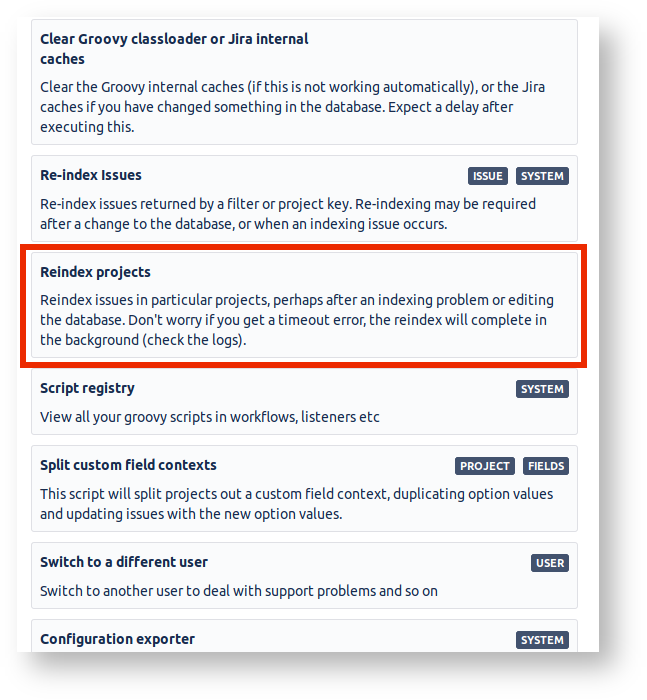 $JIRAHOME/scripts/com/onresolve/scriptrunner/canned/jira/admin/ReindexProjects.groovy - In JIRA type