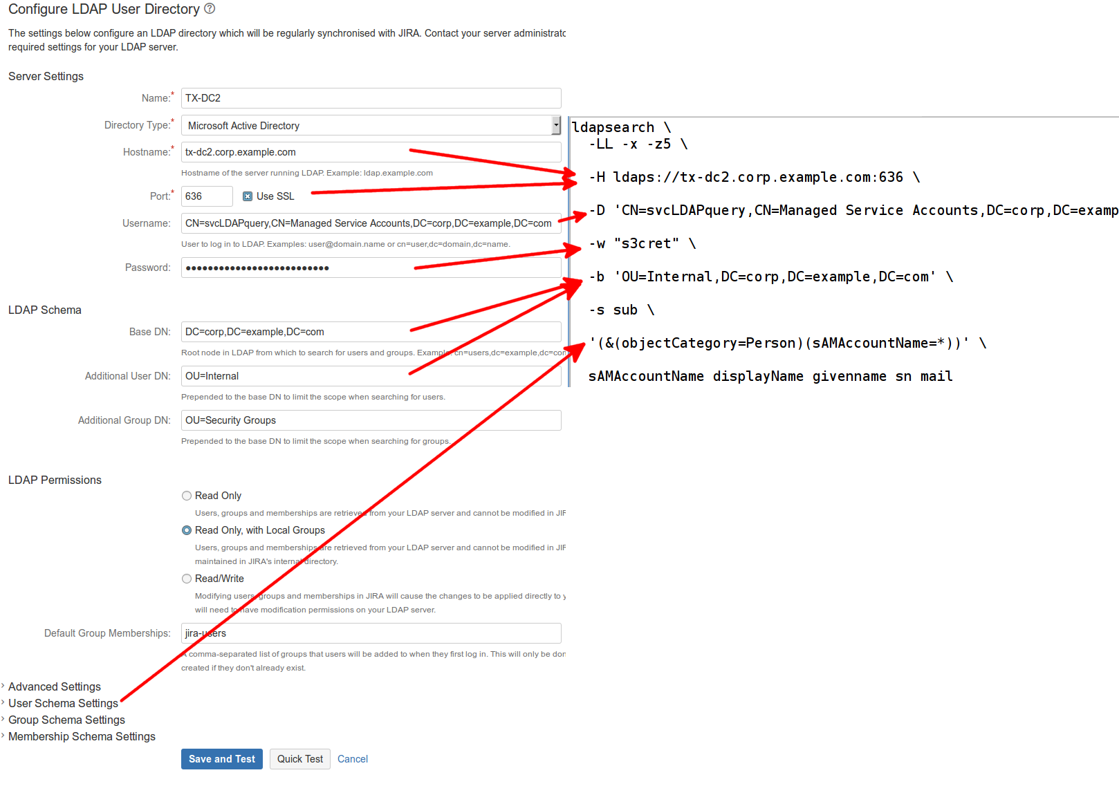 If you can see the existing JIRA/Confluence User Directory, the properties map to ldapsearch parameters as follows: