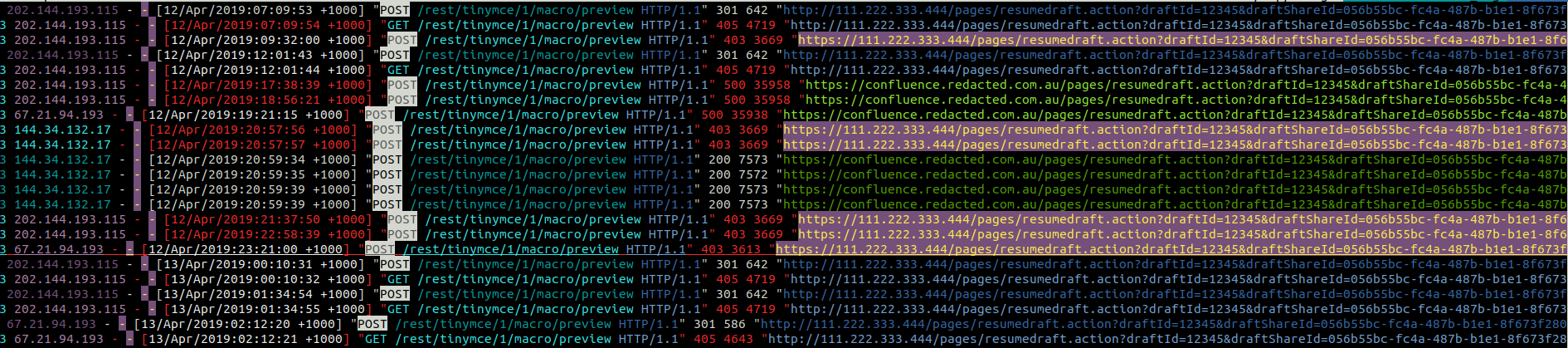 How do you figure out if you have been breached through a particular security vulnerability? Unfortunately it's not easy. Sometimes a hack will leave a characteristic stacktrace, but more often you have to trawl through the webserver access logs, looking for anything suspicious. "Suspicious" means requests from unusual IPs (e.g. in foreign countries) accessing URLs relating to the vulnerable resource. Sometimes the vulnerable resource URL is made explicit in Atlassian's vulnerability report (if the mitigation if "block /frobiz URLs" then you know /frobniz the vulnerable resource), but sometimes there is no simple correlation. For instance, the 2019-03-20 security vulnerability in in the Widget Connector, but in the logs the only symptom is a series of anonymous requests to the macro preview URL: