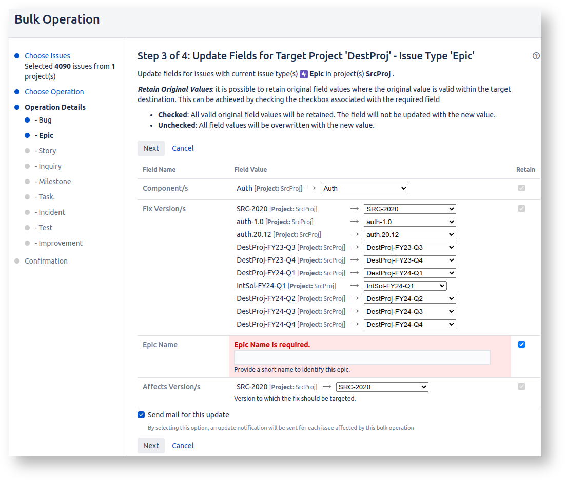 The next problem may show up in Step 3 when you get to Epics. The bulk move wizard says Epic Name is required :