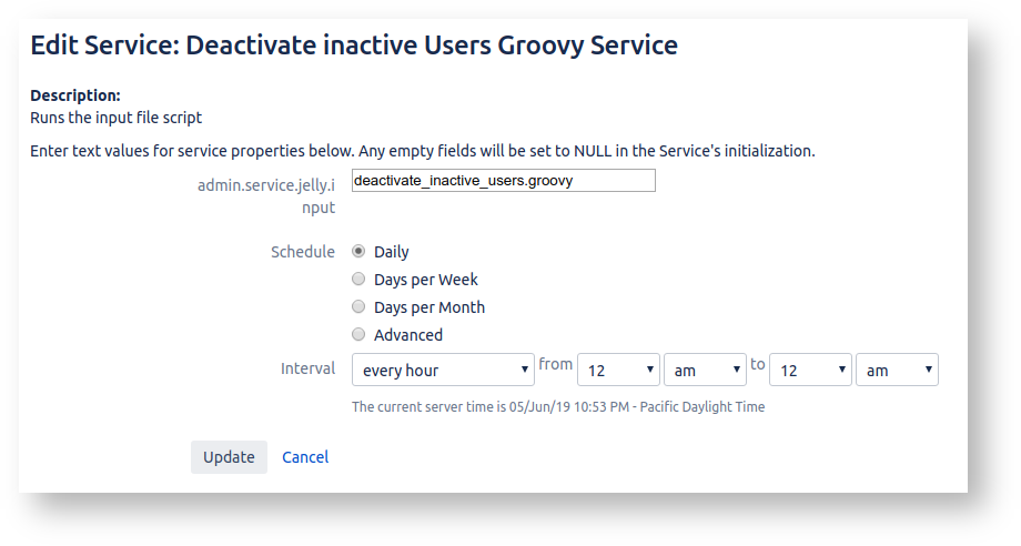 The script should be installed in $JIRAHOME/scripts/deactivate_inactive_users.groovy and invoked automatically as a service, as described above.