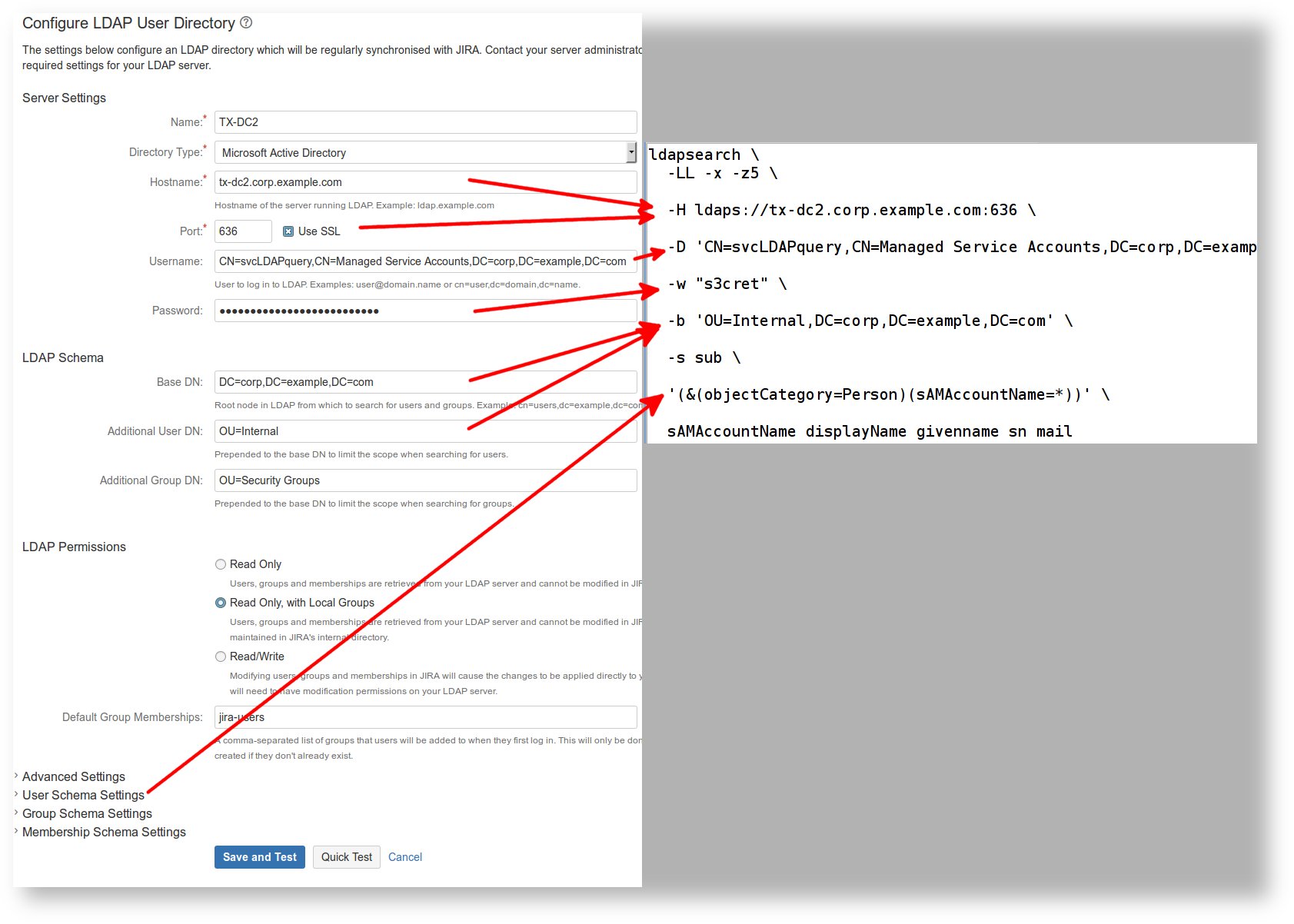 If you can see the existing JIRA/Confluence User Directory, the properties map to ldapsearch parameters as follows: