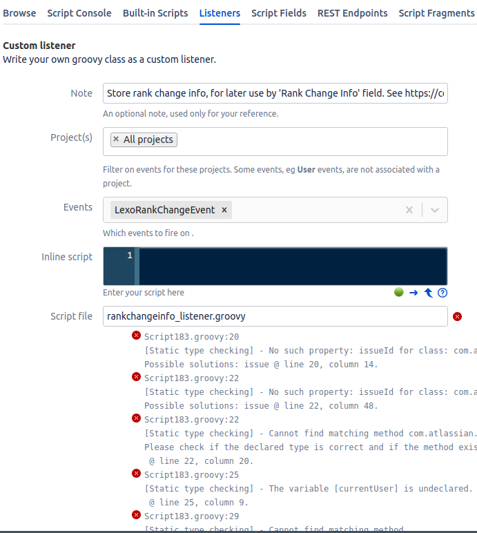 There will be a lot of some unavoidable static type checking errors because ScriptRunner is not able to find the LexoRankChangeEvent class, which is technically part of a plugin.