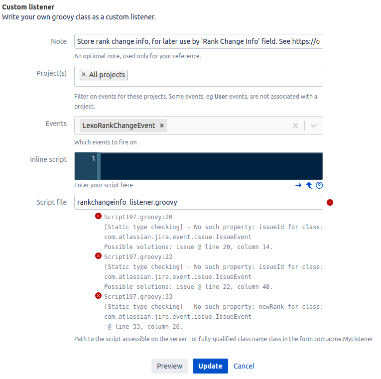 Next, in Jira, type 'gg' (admin shortcut) 'Script Listeners' to bring up the ScriptRunner Script Listeners page. Add a new Custom listener, listening to event LexoRankChangeEvent, and invoking our groovy script: