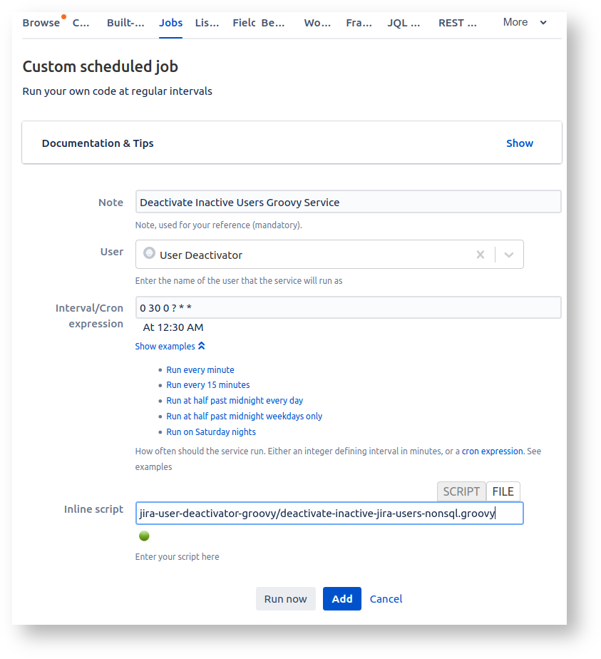 If all looks good, go to Jira's Services admin page, and add a service of type com.onresolve.jira.groovy.GroovyService- Warning - I am finding that users are not actually deactivated, when the script is run like this as a service. The script runs successfully judging by the logs, but users are unaffected. YMMV - I have not yet debugged this, and it may affect only my Jira 8.5.1 instance.