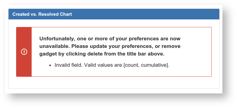 Broken portlets can be fixed individually by editing them and setting However only the dashboard owner can do this, and it's not exactly intuitive. This page describes a SQL fix to migrate all Created vs Resolved portlets to the new preference format. |