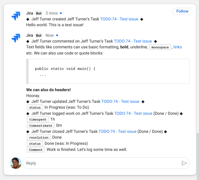 Google Chat (https://chat.google.com) is Google's take on Slack for internal business users. At a client's request, we wrote a Groovy script that lets Jira message a Google Chat room when Jira is updated: