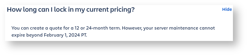 "How long can I lock in my current pricing" FAQ in the Billing & licensing questions section of the Future server pricing page, it will to renew for 24 months: