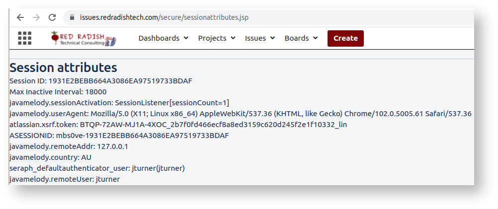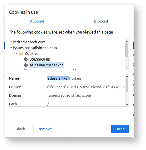 The session attribute we care about here is atlassian.xsrf.token. An XSRF token is a secret bit of text known only to the Jira server and your browser. In your browser you can see the same XSRF token in a cookie by clicking on the padlock icon to the left of the URL: