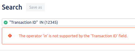 • with text fields, you can't use JQL's IN operator ("Transaction ID" IN (10002, 10003)):