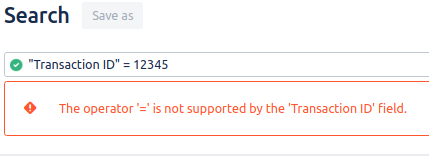• with text fields, you can't use JQL's equals operator ("Transaction ID" = 10002)