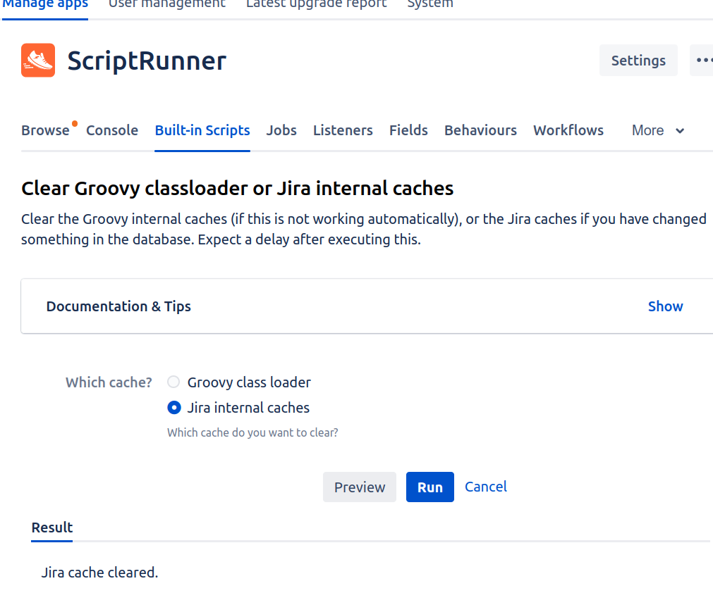 Normally you would need to restart Jira to pick up this change, but thanks to ScriptRunner's ever-useful Clear Groovy classloader or Jira internal caches built-in script we don't have to:
